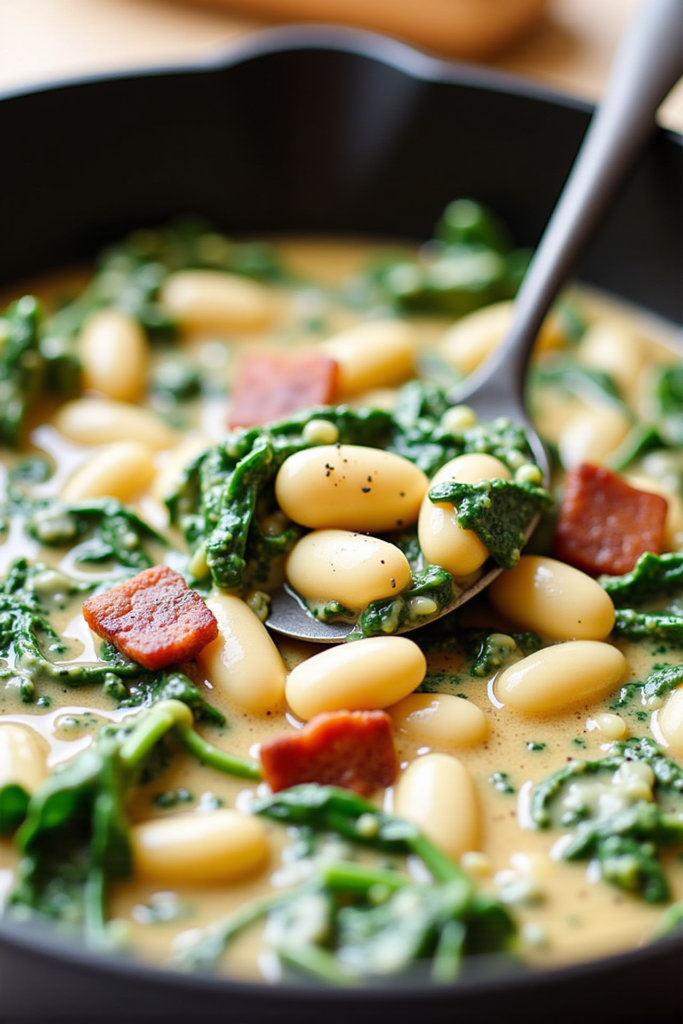 Start by sautéing garlic and shallots in olive oil to release their aromatics, then deglaze with a splash of vegetable broth. Canned white beans absorb flavors from tomato paste, Italian seasoning, and a pinch of crushed red pepper. Wilted spinach adds freshness and nutrition, while a sprinkle of grated Parmesan or nutritional yeast creates a creamy finish.